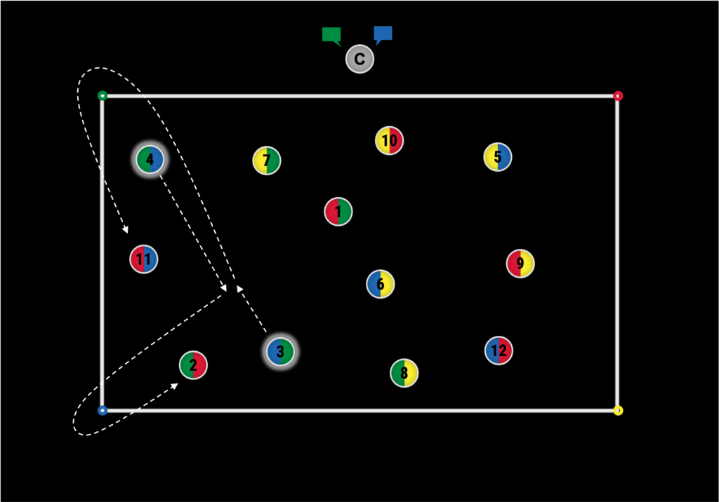 - A colour command from the coach, for example, “blue”, chooses the teams.