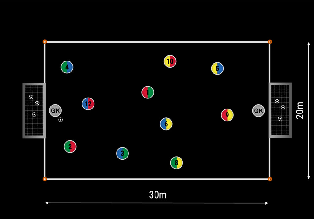 - With a colour command from the coach, for example, “red”, all players with red on their shirt assemble as fast as possible by the coach.