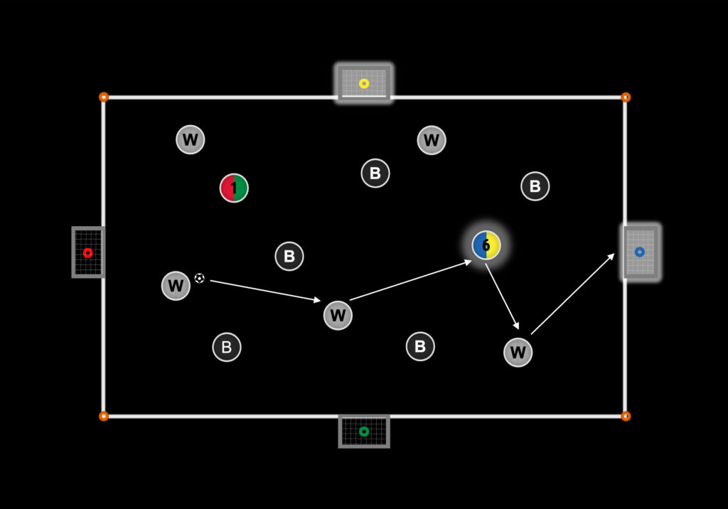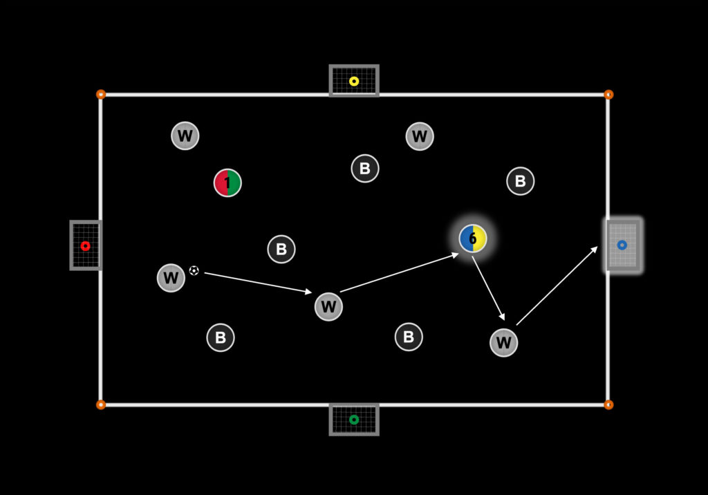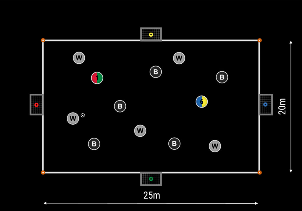 - In this variation 4 mini goals are placed, one on each side of the pitch.