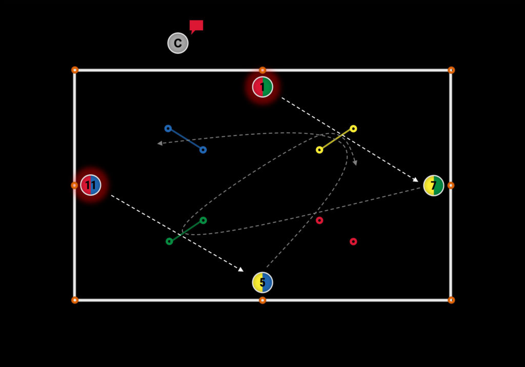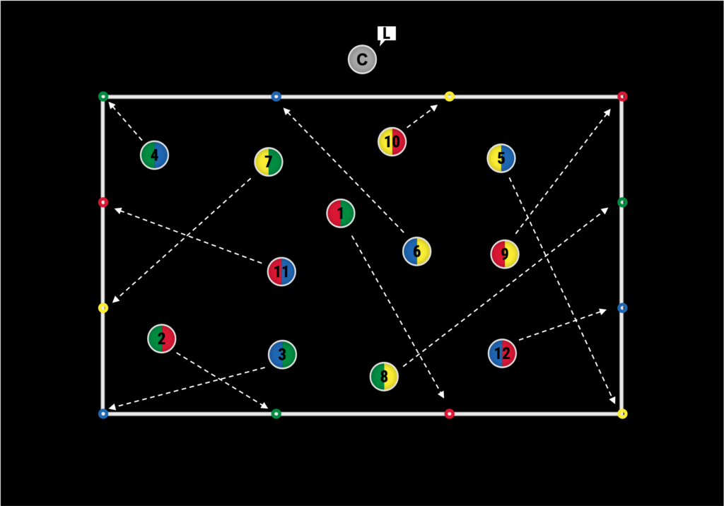 - A new colour is called with each ball that comes into play. This creates constantly changing teams and game scenarios, to which the players must react.