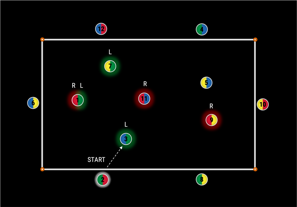 - After a side command from the coach, for example, “right”, every player sprints as fast as possible to a cone with the same colour as the called side of their Skillshirtz.
